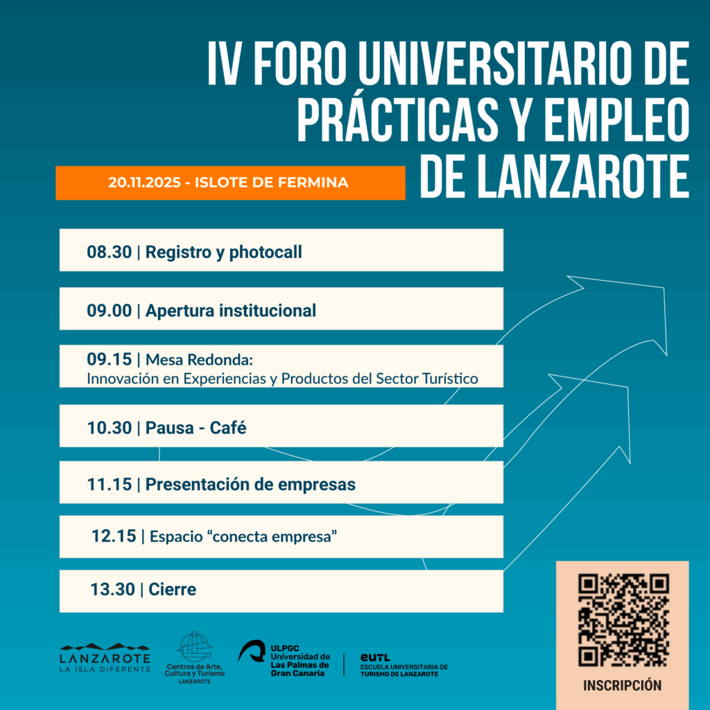 La Escuela Universitaria de Turismo de Lanzarote (EUTL) celebra el próximo jueves 20 de noviembre de 2025 el IV Foro Universitario de Prácticas y Empleo de Lanzarote, en el Islote de Fermina (Arrecife), un encuentro en el que colabora Turismo Lanzarote y los Centros de Arte Cultura y Turismo de Lanzarote (CACT) y que se consolida como un espacio clave para conectar el talento universitario con el sector turístico.