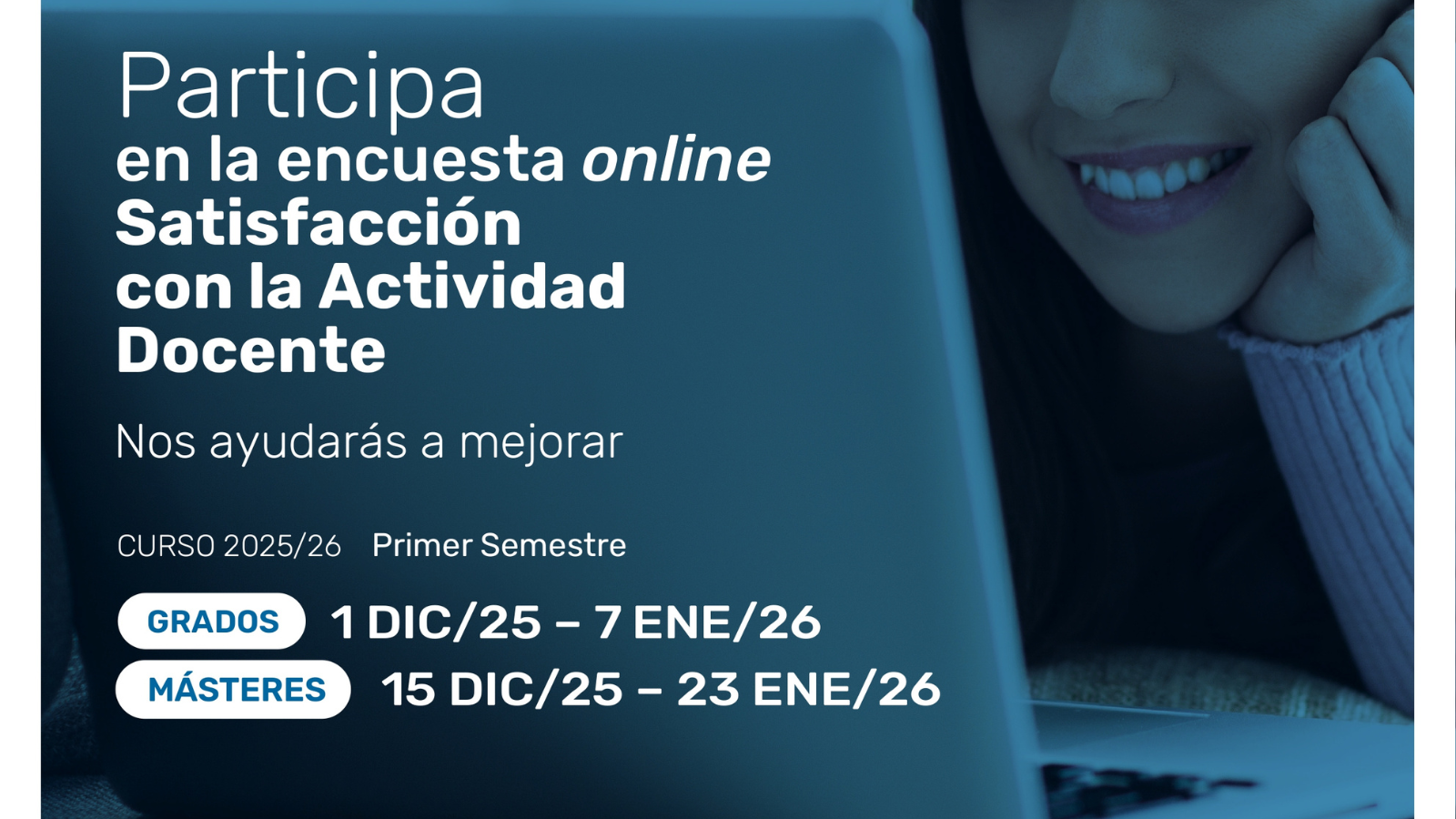 Durante los meses de diciembre de 2025 y enero de 2026, el estudiantado de la Universidad de Las Palmas de Gran Canaria (ULPGC) está llamado a participar en las encuestas de valoración docente, una herramienta clave para la mejora de la calidad de la enseñanza.