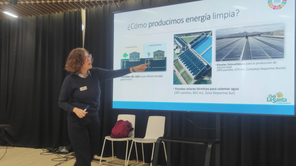 A continuación, Maider nos realizó una exposición relacionada con la sostenibilidad y cómo esta forma parte de la vida diaria del Club La Santa. Algunos temas expuestos fueron el cómo producen energía limpia (bombas de calor que utilizan energía geotérmica, paneles solares térmicos para calentar el agua y uso de paneles fotovoltaicos para producir electricidad), cómo usan un sistema automatizado para el control de la energía, del consumo responsable en la iluminación, gestión del agua, gestión de residuos, de la colocación de dispensadores de agua para los clientes, etc. Todo con el objetivo de seguir ahorrando energía y gestionarla de forma eficiente. El Club La Santa cuenta con un Certificado Oficial de Eficiencia Energética «A» y dispone de algunas de las mejores tecnologías para conseguir un ahorro energético a largo plazo. Posteriormente realizamos un recorrido por las instalaciones, visitamos la planta desaladora del hotel y nos explicaron su funcionamiento.